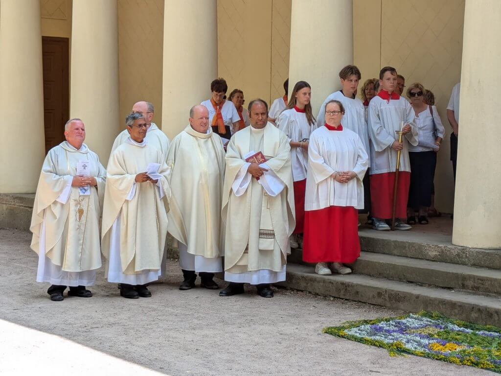 Bereits am Freitag hatten die Männer vom Bauhof das Zelt aufgestellt, dass uns die Stadt freundlicherweise kostenlos zur Verfügung gestellt hat. Am Sonntag, den 29. Juni, kam früh Bewegung in den Schlosspark. Bänke wurden aufgestellt, der Getränkewagen bestückt, der Festsaal in eine Kirche verwandelt, im Park Altäre aufgebaut und vor der Orangerie ein Blumenteppich gestaltet.
