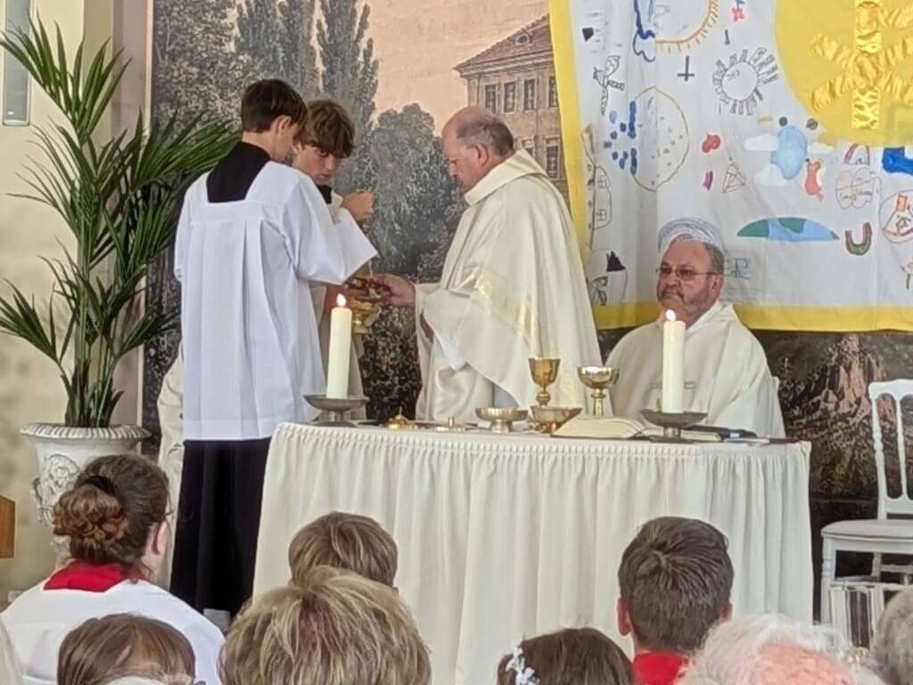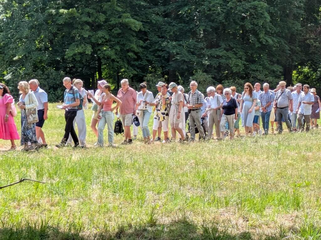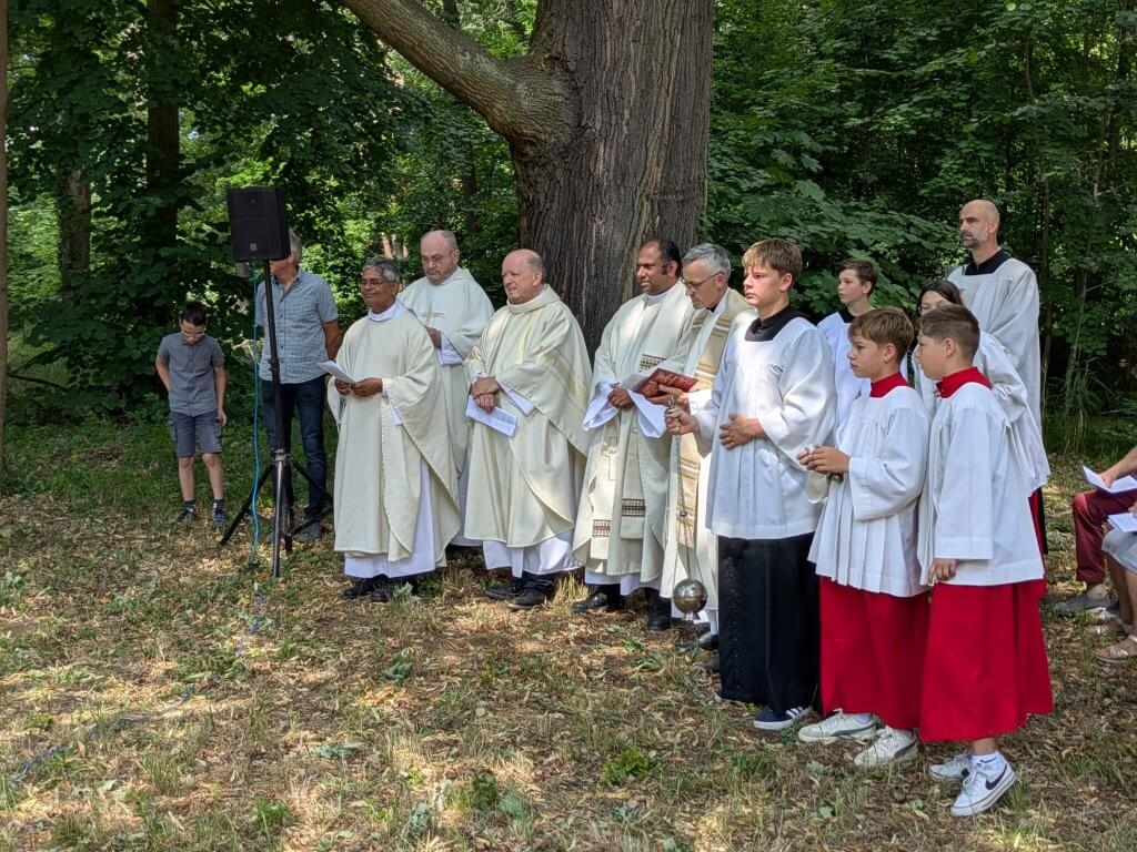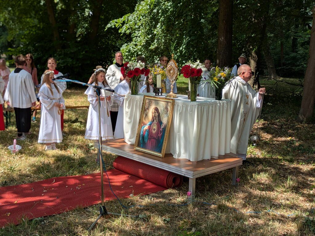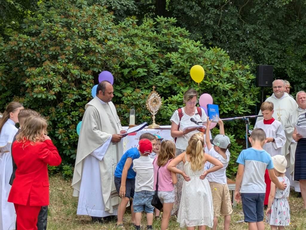Um 10.30 Uhr begann der festliche Gottesdienst mit den Chören aus Großräschen und Lübbenau, den Bläsern aus Lübben und Ministranten aus verschieden Gemeinden unseres Dekanates. Pater Norbert Ensch, der neue Pfarrer von Finsterwalde, hielt die Festpredigt. Er erinnerte an den Auftrag Jesu, dass wir den Menschen zu essen geben sollen. Dabei gehe es um mehr, als den leiblichen Hunger zu stillen. Wir schaffen das, wenn wir Jesus nachgehen, jeder auf seine ganz besondere Art und Weise. Das taten die etwa 300 Teilnehmenden dann auch buchstäblich. Jesus, den wir in der Gestalt des eucharistischen Brotes verehren, führte die Prozession durch den Schlosspark an. Unterwegs gestalteten Kinder aus Lübben, polnische Christen und Jugendliche aus Lübbenau Impulse an den verschiedenen Altären.