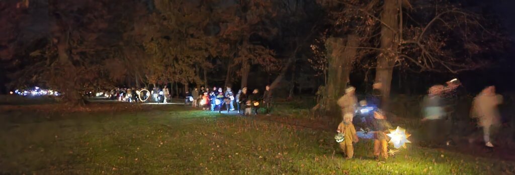 Bald danach ließ sich Martin taufen. Er verließ die Armee und wurde von Bischof Hilarius in Poitiers zum Priester geweiht. Einige Jahre lebte er als Einsiedler in einer Hütte im Wald bei Poitiers. Als 371 der Bischof von Tours starb, wollten die Menschen Martin zum Bischof haben. Aber Martin wollte lieber in der Einsamkeit bleiben und beten. Der Legende nach lockten die Menschen Martin mit einer List in die Stadt. Als er die vielen Menschen sah, versteckte er sich in einem Stall, aber die Gänse schlugen Alarm und verrieten sein Versteck. Nach so viel Geschnatter, Gebet und Gesang kam Martin am Ende des Gottesdienstes mit seinem Pferd und lud die Kinder ein, mit ihren Laternen in den Schlosspark zu ziehen. Ein Lichtermeer, dass uns jedes Jahr daran erinnert, was Gutes in der Welt bewirken kann.