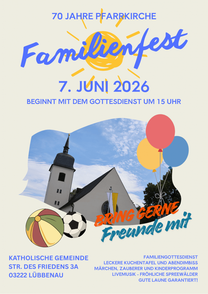 Am 7. Juni laden wir alle Gemeindemitglieder sowie Freunde, Nachbarn und Interessierte herzlich zu einem großen Familienfest ein. Unsere Pfarrkirche wird 70. Gemeinsam wollen wir dieses runde Jubiläum in fröhlicher Atmosphäre feiern. Gottesdienst und Begegnung stehen dabei im Mittelpunkt.